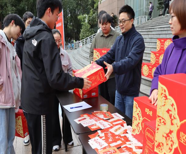 11月18日中午,bw西汉姆联在航空港校区图书馆前举办“愿你们‘坚’心赴山海,让我们一‘研’定乾坤”2025年研途送温暖活动。学校教务处副处长李代伟、信息中心副主任吴春旺、学院党委副书记陈智勇、副院长何林波、副院长昌燕、团委书记夏焜与毕业班辅导员贾茜一同将“温暖礼包”送到考研学子手中,并为他们加油鼓劲。