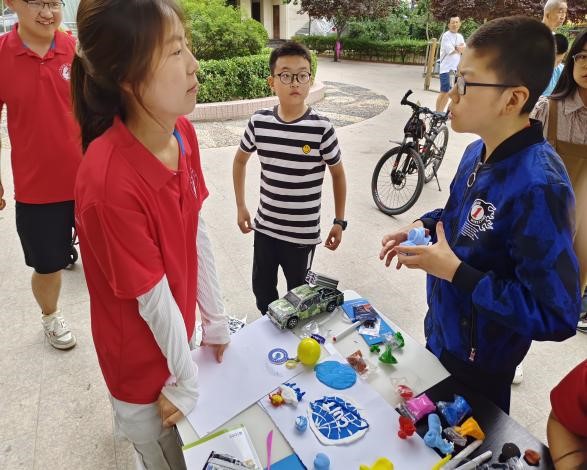 13日,成员们在社区摆好桌子并贴上海报,吸引社区周围的小朋友和家长来参加,在成员们的热情讲解和社区工作人员的鼓励下,小朋友们纷纷开始尝试手绘创作、粘土塑形、手工模型、气象知识问