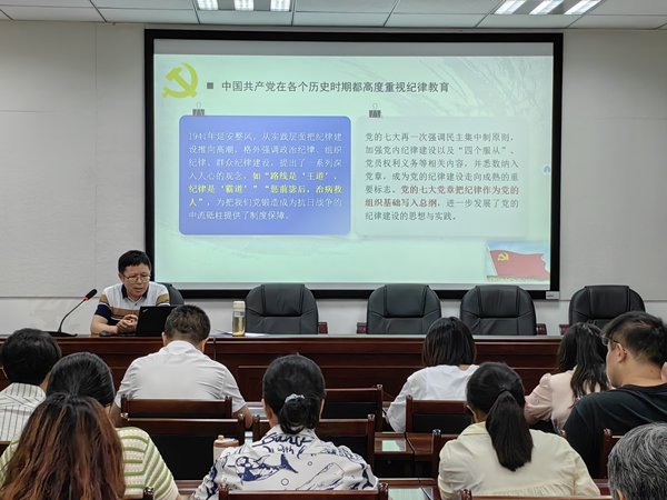 张仕斌从“中国共产党纪律建设百年历程及经验”“新时代以来加强纪律建设的重大举措”“新修订的《中国共产党纪律处分条例》有哪些亮点”“违反党纪处分规定”等方面结合生动的事例向全体党员做了详细讲解。