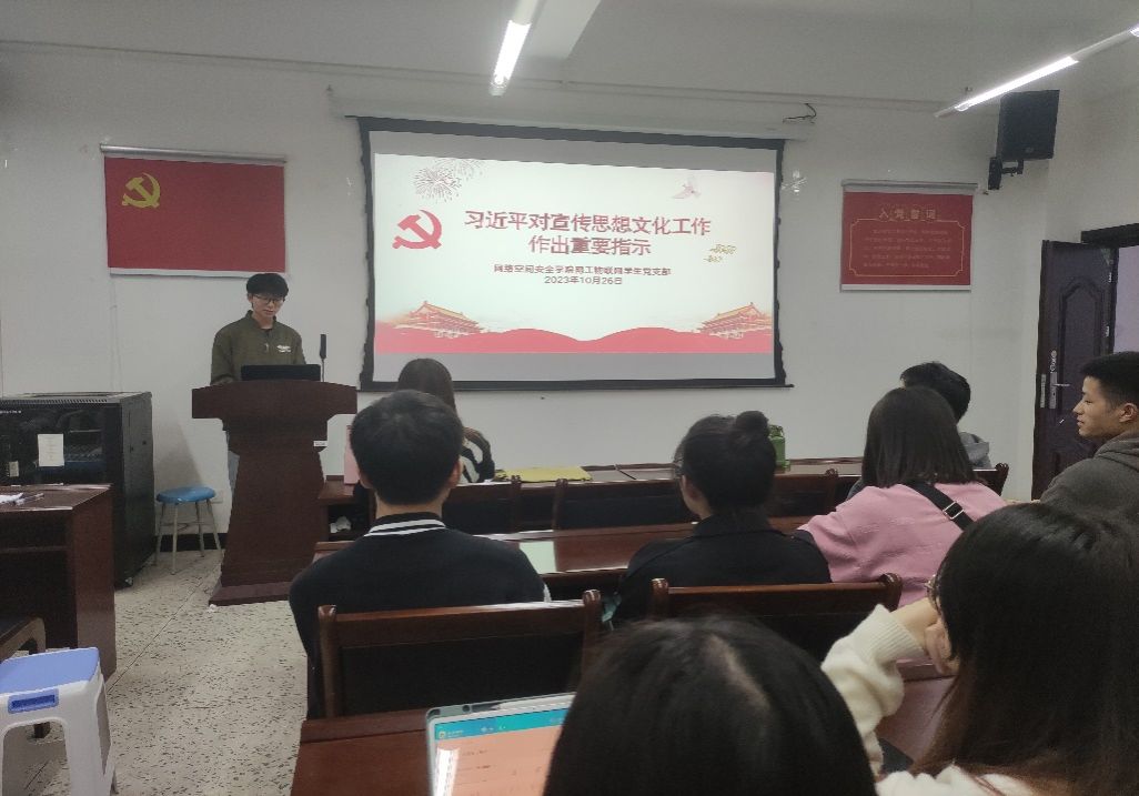 2023年10月26日下午18时,网工物联网学生党支部于C405召开了关于学习贯彻习近平对宣传思想文化工作作出重要指示的专题学习会。支部书记何佩遥老师、支部全体党员和预备党员同学参加了此次会议,会议由支部副书记马海峰同志主持。