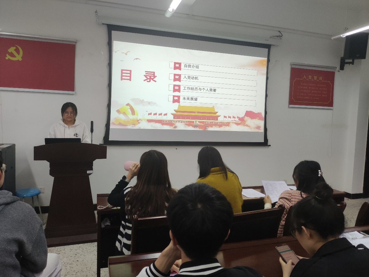 经过前期考察和推荐,本次答辩会共有19名入党积极分子参加。本次答辩会采用3分钟自我阐述、现场提问的方式对参加答辩的入党积极分子进行考察。入党积极分子从思想政治、道德品行、学习成绩、作用发挥及未来规划等方面进行自我阐述,详细介绍自己的入党动机,思想认识和现实表现情况,充分表达了自己向党组织靠拢的意愿。然后,各位党员同志就党的理论知识、现实情况进行提问,对他们进行进一步了解和考察。