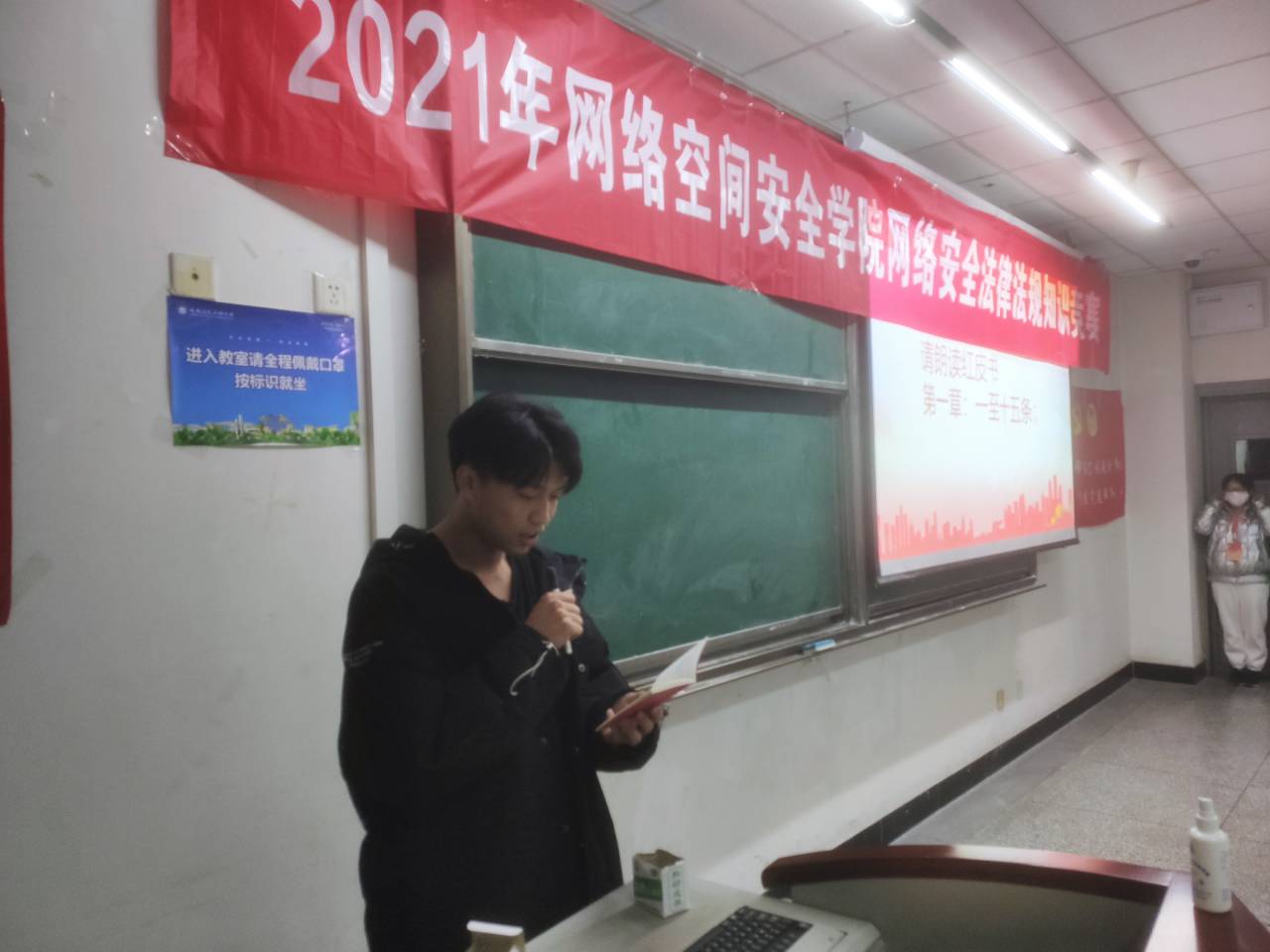 本次竞赛采取开卷考试形式,题型包括单选题、多选题、判断题和简答题。待所有人签到并领取中华人民共和国宪法和中华人民共和国网络安全法两本册子之后,主持人上台带领所有党员齐读中华人民共和国宪法第1-15条法律。随后,主持人向参赛者介绍本次知识竞赛规则和纪律要求:参赛者在考试期间不可使用任何电子产品。答题过程中,参赛者聚精会神,奋笔疾书,教室里回荡着翻页声。本场竞赛时间为一小时,结束后,参赛者们安静有序的离场。批阅试卷的过程保证公平、公正、公开,本次竞赛设置了一等奖4名,二等奖6名,三等奖10名。