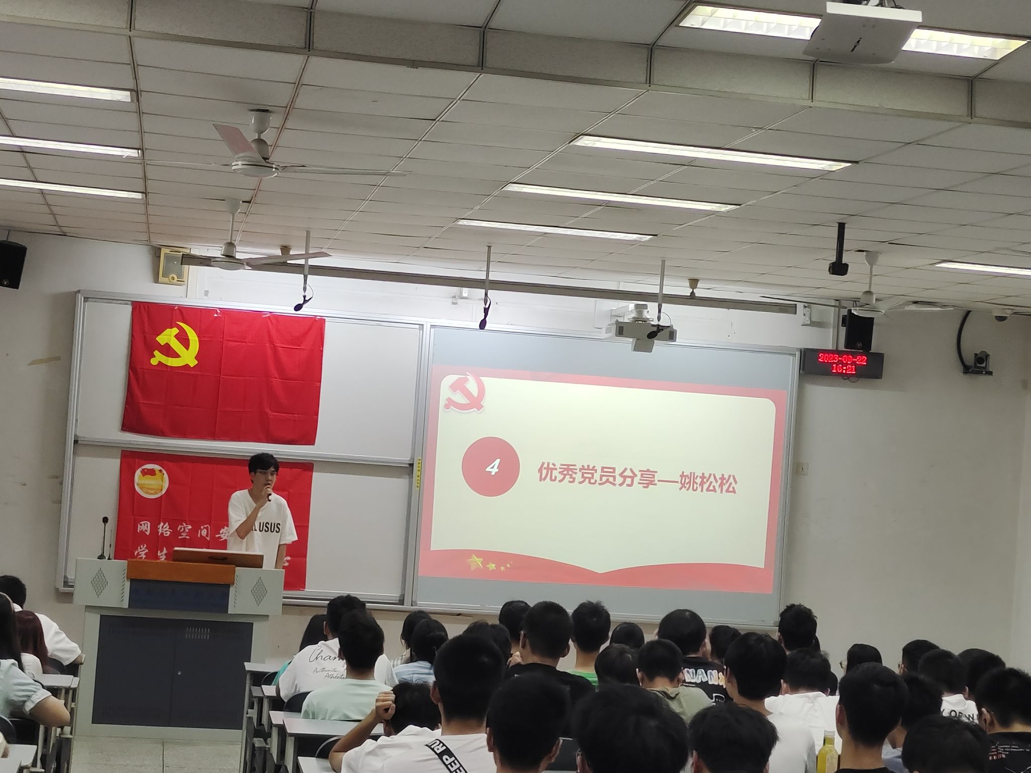 答疑环节结束后,优秀党员姚松松同学上台向大家分享自己的经验。他以自身的成长故事为例,鼓励大家在大学期间努力学习、培养多种兴趣爱好,争取全面发展,以成为更优秀的人。姚学长的真诚分享给同学们带来很多启发,激励我们成为更加优秀的大学生,向党员标准靠拢。