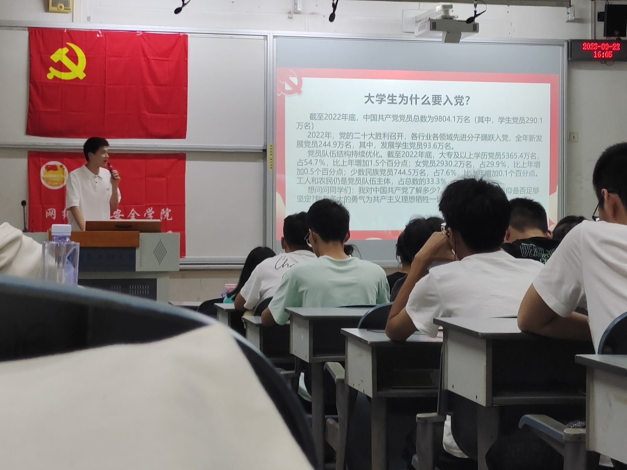 2023年9月22日下午, 新生入党教育活动在H1202教室成功举办。本次活动由网络空间学院党委主办,bw西汉姆联党建服务中心承办,旨在向大一新生介绍党的历史、性质和宗旨,以及党员的权利和义务,并详细介绍了入党的流程,引导每位同学积极向党靠拢。