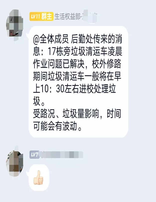 一)噪音问题问题反映:学生住宿17栋旁垃圾清运车凌晨工作影响同学们睡眠。解决情况:通过老师与网安生活权益部工作人员向学校后勤处反应将垃圾清运车时间调整为早上十点半左右进校处理垃圾。