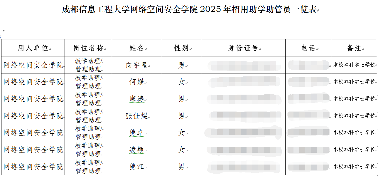 根据《成都信息工程大学2025年助学助管员招用工作方案》,经学院招用工作小组对报名的助学助管员进行资格审查、面试考核、心理测评、体检、考察,拟录用以下人员为学院助学助管员。