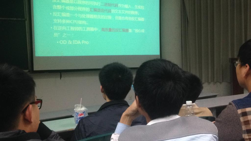 首先是李宇涵同学对逆向技术的介绍,并谈及了他自己学习逆向的经验,推荐了几本适合学习的书籍。后又对一款外挂软件进行了简单的逆向演示,引起同学们的高度关注,是此次班会的一次高潮。接着由卢一昂同学讲解渗透方面的知识,先教会了大家如何通过改hosts或挂VPN科学上网,之后又进行了一次PC机之间的远程控制,再一次引起了轰动。