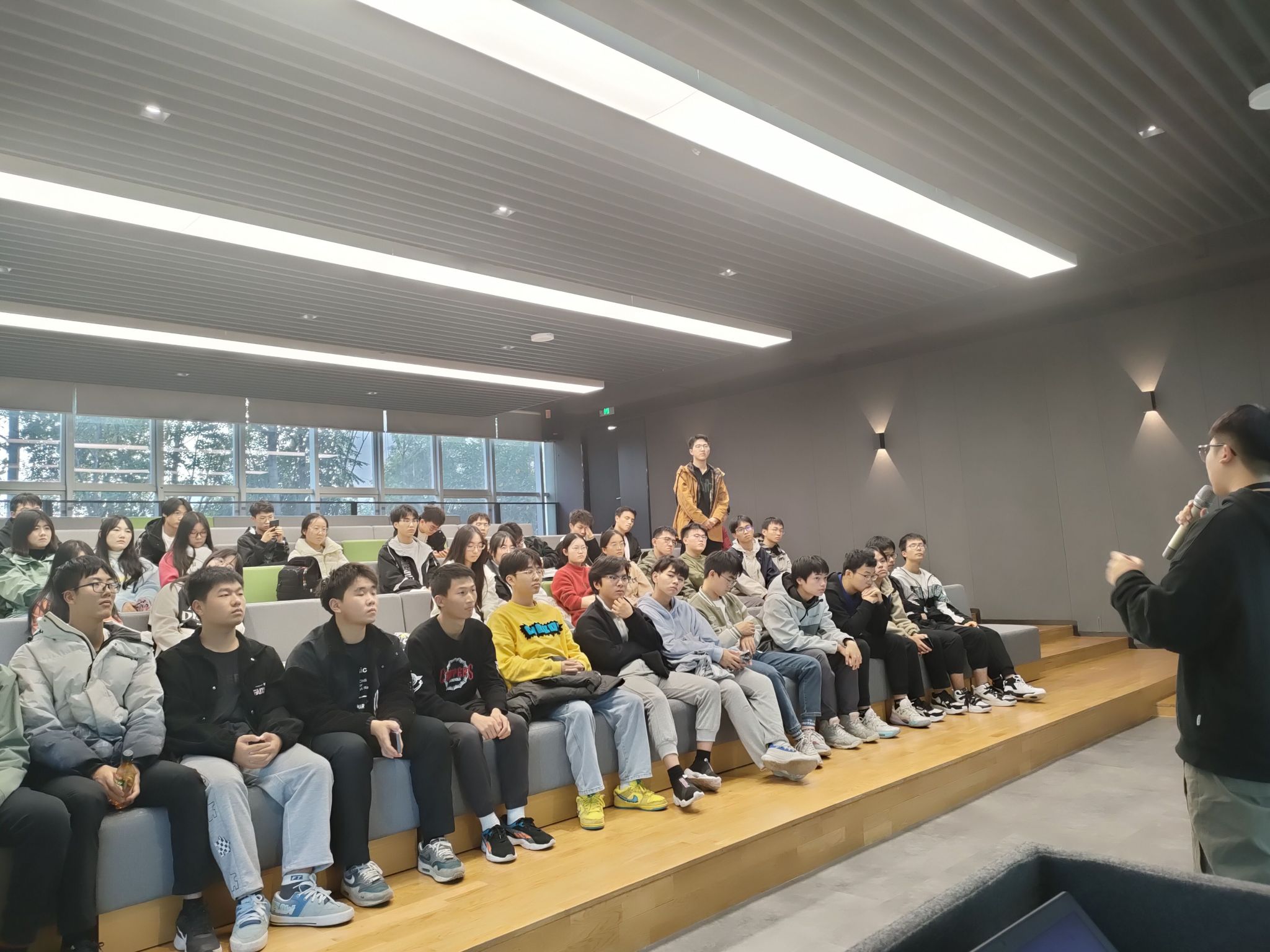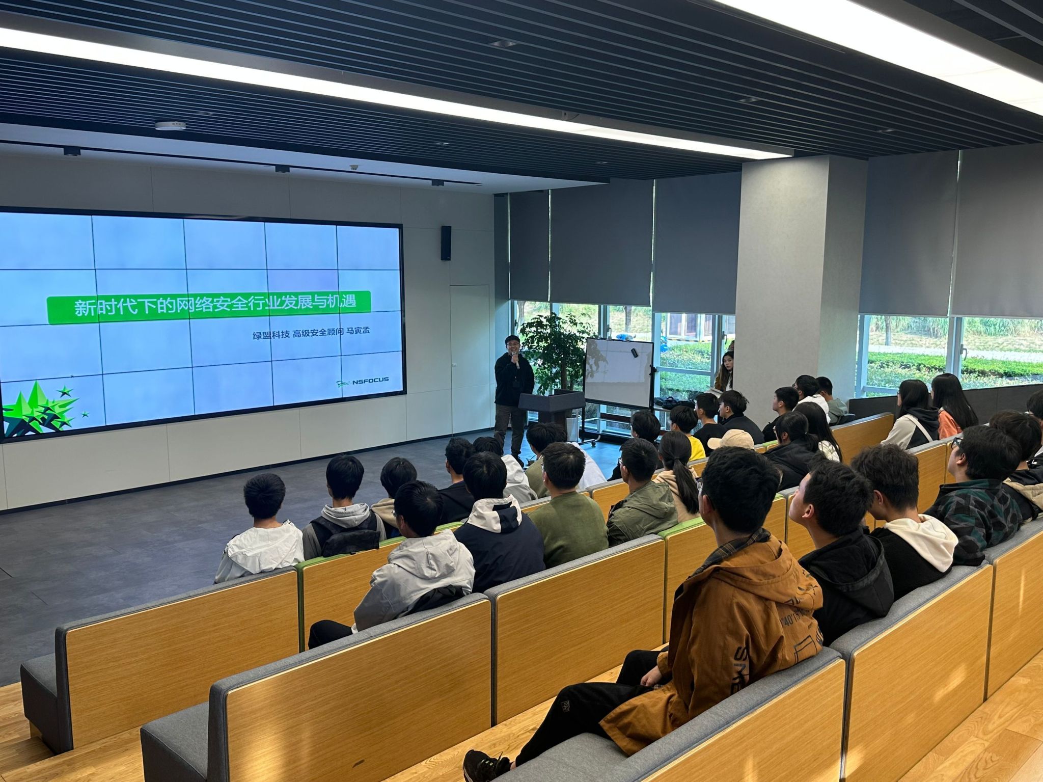 参观结束后,绿盟科技有限公司高级安全顾问马寅孟在阶梯教室给同学们开展了一场以“新时代下的网络安全行业发展与机遇”为主题的座谈会。座谈会中,马寅孟老师为我们分析了我国网络空间发展形势,为同学们指明了未来的职业规划以及发展道路。讲解过后,同学们还根据自身的存在的疑惑向老师提出了问题,马寅孟讲师也耐心地一一作答,让同学们受益匪浅。