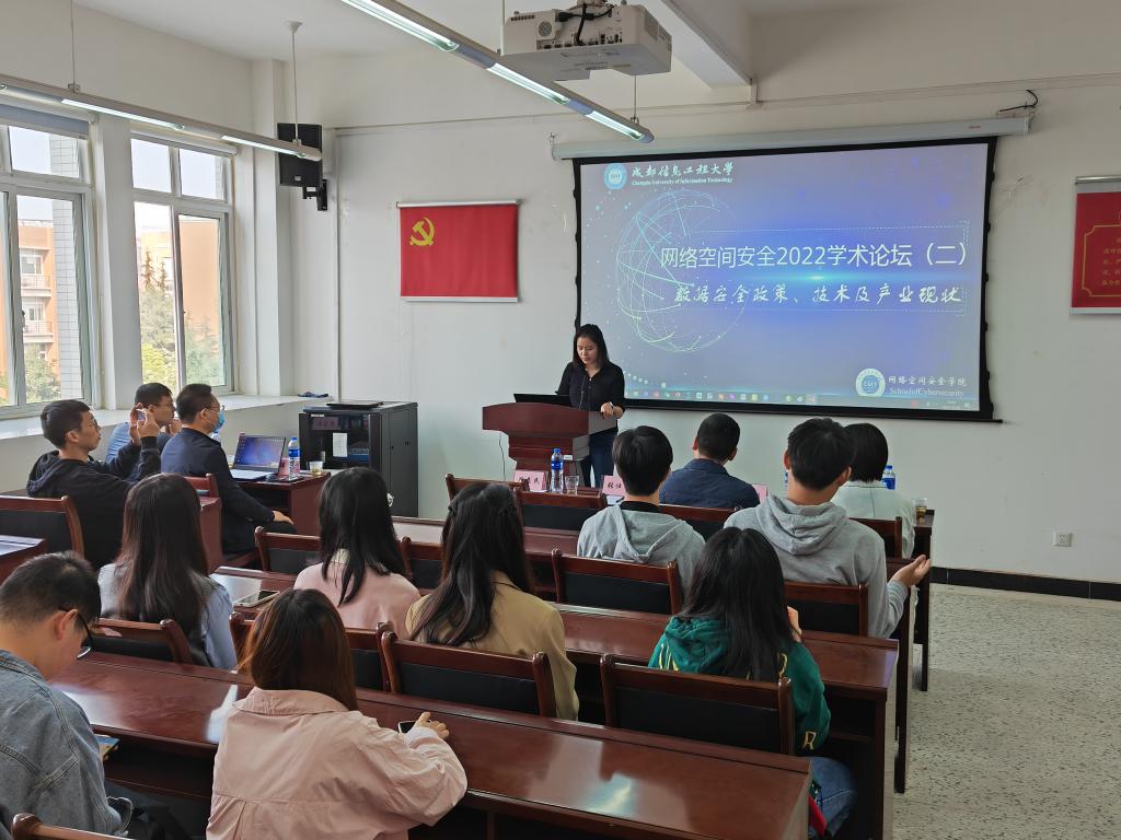 2022年10月20日上午十点,bw西汉姆联2022年学术论坛(二)——数据安全政策,技术及产业现状介绍如期在C405举行。本次论坛主题是数据安全政策,技术及产业现状介绍。出席本次论坛的领导和嘉宾有bw西汉姆联党委书记张仕斌教授,bw西汉姆联副院长昌燕教授,卫士通研发中心副总经理齐伟刚先生,数据安全产品线副总经理刘从祥先生,以及数据安全高级售前经理焦志敏先生。