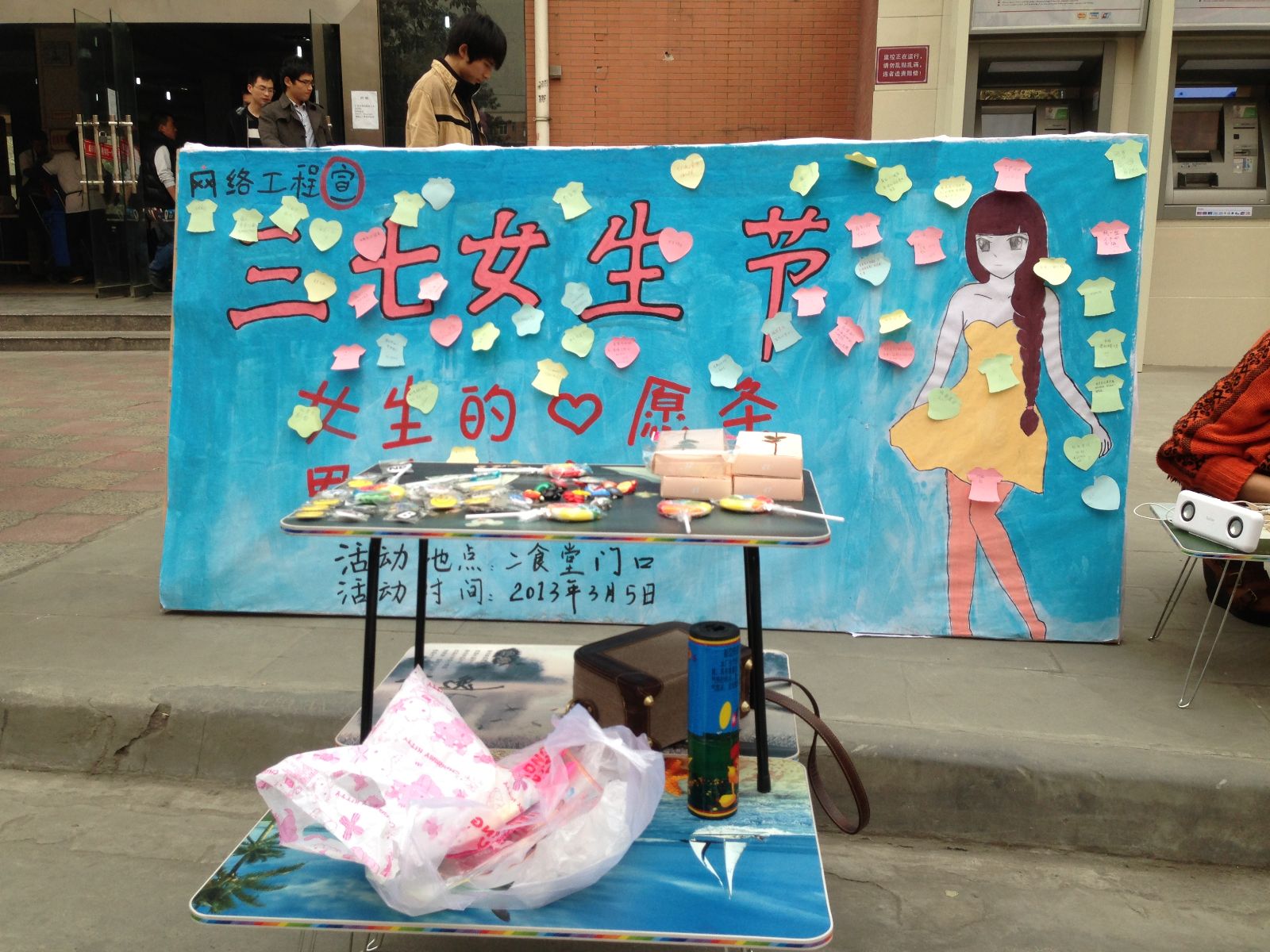 【本网讯】为更好的服务女生,活跃女生节氛围,发扬女生节传统,3月7日中午12:00整,成都信息工程学院传统的3.7“女生节”活动在同学们的期待中于一食堂外的校道上正式拉开帷幕。本次活动“心语心愿”环节由信息安全工程学院女工部精心策划。