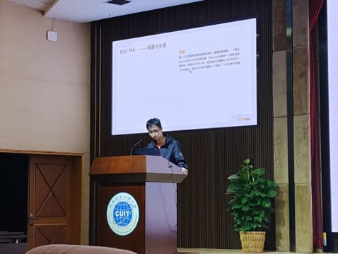 然后由Syclover前负责人,信息安全2019级的梁嘉乐同学,讲述了他与YAK相识以来这一年的故事:“初时YAK,有惊喜,也有失望!”。梁嘉乐在会上提到:“让bw西汉姆联的学生以及其他学院的学的学子可以更加深刻的认识到YAK能为我们带来什么,对我们的日常生活有什么影响,才能更加坚定的选择自己的方向。”