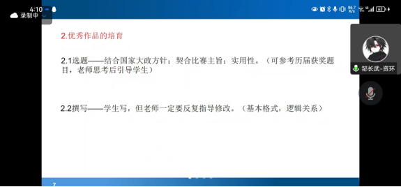 邹教授从学科竞赛的组织管理和优秀作品的培育两方面进行分享。学科竞赛是“教+学”的双边活动,管理层要调动老师和学生的积极性并做好管理工作,教师要有情怀、责任心,指导学生。优秀作品的培育中选题要结合国家大政方针、契合比赛主旨,学生撰写时老师一定要反复指导修改。