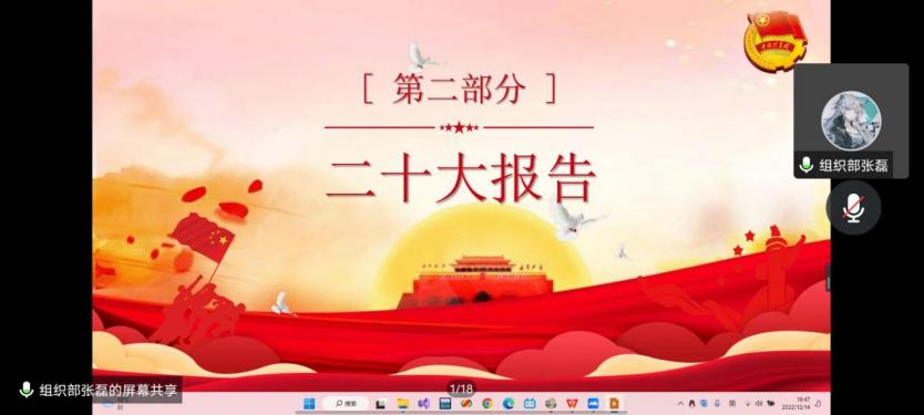 为进一步加强爱国教育,弘扬爱国主义精神,增强民族文化自信心与自豪感,强化对青年团员的思想政治引领,引导动员青年团员学习党的二十大精神,我院组织部于12月14日在线上开展了本次二级团校培训班的第三次团课。本次课程由组织部李圣民同学主持,内容上分为“爱国主义”和“深入学习贯彻党的二十大精神”两大板块,分别由组织部沈琳月同学和张磊同学讲解。