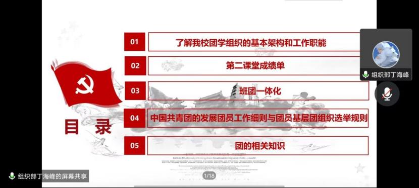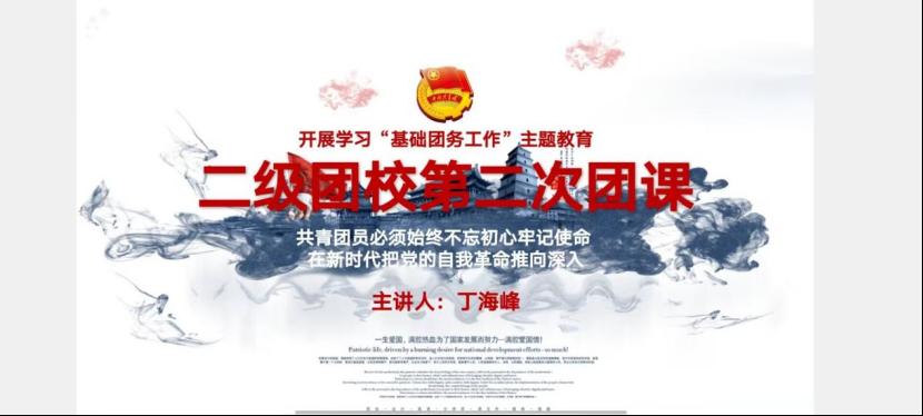 团课还详细介绍团的相关知识:如何发展新团员,如何进行团系统,如何对团结奖励与惩罚。值得一提的是,为增加团课的互动性与趣味性,丁海峰同学用问答的形式让学员对团旗、团歌、团徽的使用有了更深刻的记忆,学员们也积极参与其中,回答问题。最后,团课以一段有关团学教育的精彩视频结束。