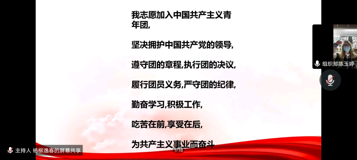 纵使疫情让我们无法在线下见面,但我们依旧保持着对党、对团的热爱。本次开班典礼在杨柳逸春精彩的主持中顺利召开,学院代表陈玉婷带领全体学员重温入团誓词后,学员齐唱团歌,团委副书记向星睿为全体学员致培训开幕词,组织部负责人胡越围绕“中国共产主义青年团知识”的主题展开第一次团课。