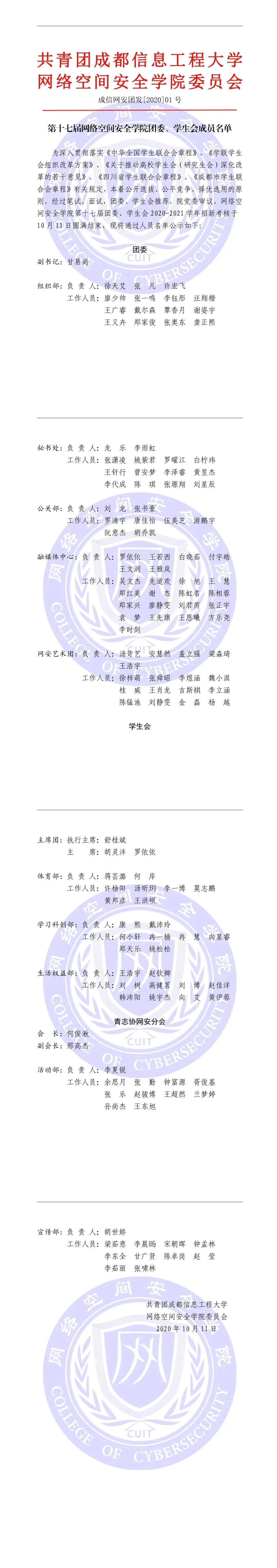 为深入贯彻落实《中华全国学生联合会章程》、《学联学生会组织改革方案》、《关于推动高校学生会(研究生会)深化改革的若干意见》、《四川省学生联合会章程》、《成都市学生联合会章程》有关规定,本着公开选拔、公平竞争、择优选用的原则,经过笔试、面试,团委、学生会推荐,院党委审议,bw西汉姆联第十七届团委、学生会2020-2021学年招新考核于10月11日圆满结束,现将通过人员名单公示如下: