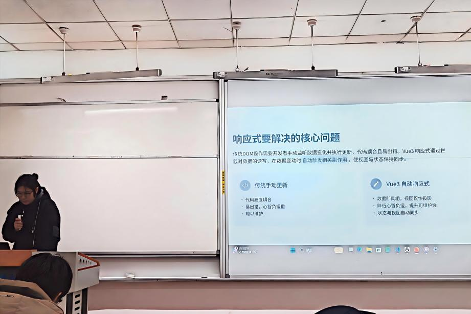 最后,陆发燎通过计算属性与侦听器的对比实验,形象说明了“精准订阅”与“自动依赖收集”如何有效提升开发效率,加深了同学们对现代前端架构的理解。